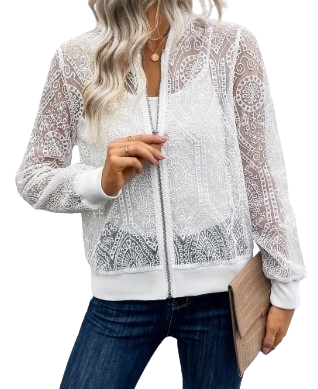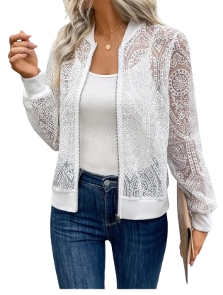 Baseball Collar Long Sleeve Cropped Cardigan with Zipper Front, Lightweight All-Season Chic Outerwear for Casual & Formal Outfits, Lace Jacket, Formal Lace Layering, Sophisticated Tailoring.