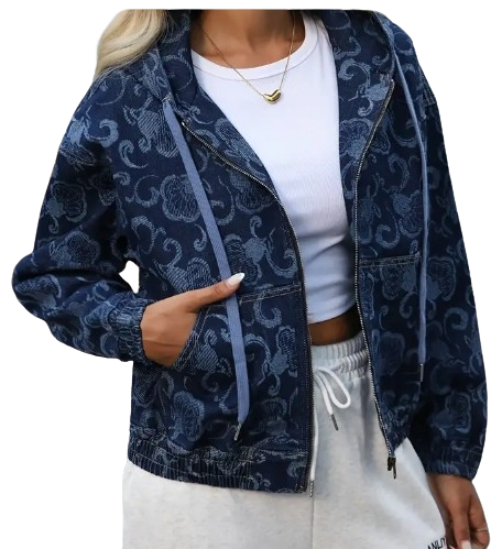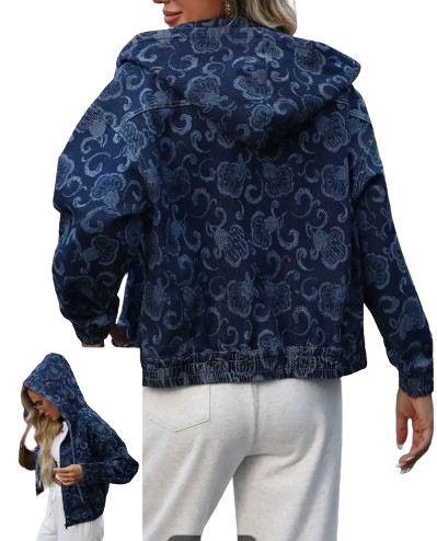 Women’s Elegant Loose Fit Hooded Denim Jacket with Floral Print